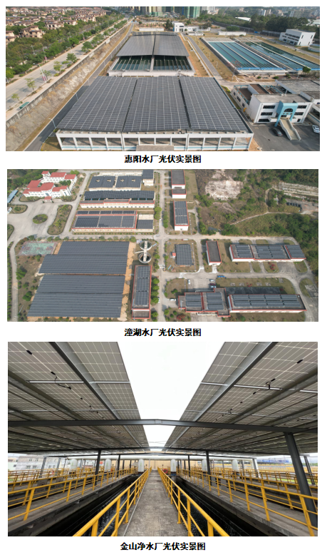市水务集团依托所属自来水厂、污水处理厂数量多、分布广,占地、池体及屋顶面积大等资源禀赋,经过深入研究论证,在惠阳水厂、潼湖水厂、金山净水厂安装光伏设备,使用面积共4.5万平方米,电站总装机容量约8.1MW(兆瓦),年均发电量约812万度,通过“自发自用、余量并网”实现降本增效。据初步测算,项目全面投用后,每年将节约标煤约6155吨,合计减少二氧化碳、二氧化硫、氮氧化物等温室气体排放7815吨,生态和环境效益显著。