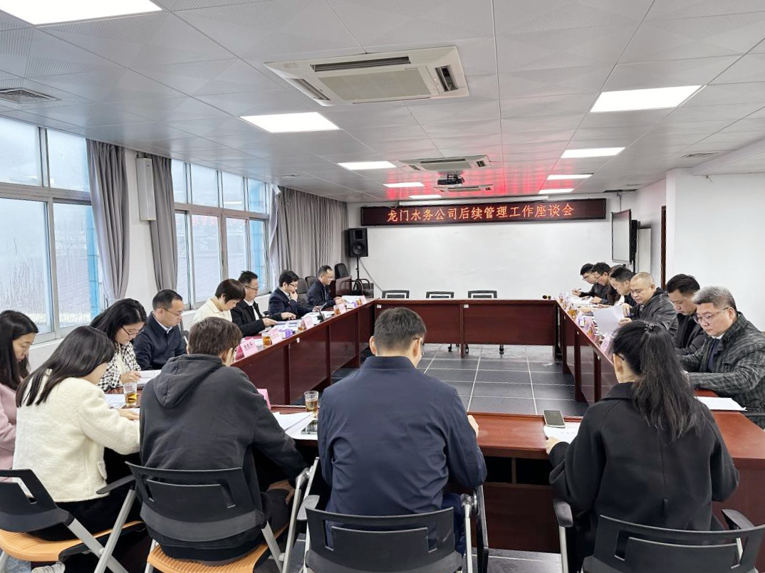 调研组一行首先到龙门县城水厂召开了工作座谈会。会上,龙门水务公司董事长曾繁昌详细汇报了相关情况,包括接管后需协调事项的进展情况、龙门水务公司机构精简方案、现有项目建设推进情况以及企业降本控费提质增效工作举措。吴胜华对龙门水务公司在划转后与集团统一思想、统一意志、统一行动表示肯定。吴胜华指出,龙门水务公司要按照市国资委、集团管理规章制度,加快完善组织架构设置以及基本管理制度的制定修订工作,重点抓好领导班子分工调整、协调事项跟进、全面预算管理、项目合规管理、二次供水市场拓展等工作。