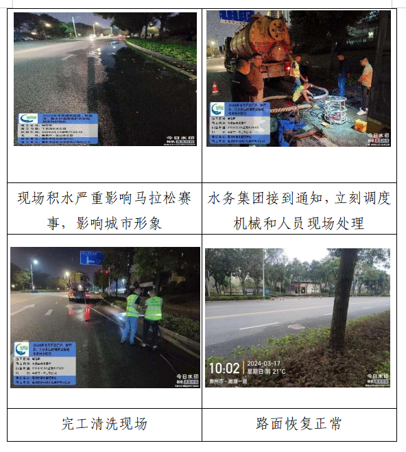 接到通知后,集团领导高度重视,立即组织相关负责人赶往现场,会同市市政园林事务中心共同开展处置工作,现场初步勘查发现沿线三个污水井无法开启,满管污水正不断往路面溢流。考虑到“惠马”赛事开跑在即,为保障“惠马”比赛顺利进行,在时间异常紧迫的情况下,集团要求市排水管理中心立即调度人员和市政排水工具车、高压冲水车、吸污车等机械车辆,对涌水路段进行紧急高压水枪冲打、封堵气囊、抽排吸污,并在吸污完成后清洗了路面。次日,集团派员实时关注路面情况,经紧急处理后的路面情况正常,路面整洁干燥,无污水溢流等情况,马拉松比赛未受影响。