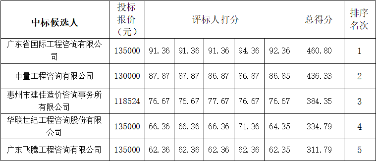 2、参与项目评标环节的投标企业名单:广东省国际工程咨询有限公司、中量工程咨询有限公司、广东飞腾工程咨询有限公司、华联世纪工程咨询股份有限公司、惠州市建佳造价咨询事务所有限公司、华联世纪工程咨询股份有限公司。