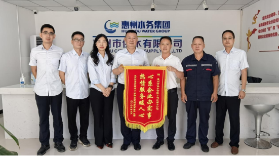 5月14日上午,惠城区伟鸿中小学综合实践活动基地吴校长一行向市供水公司汝湖分公司送来锦旗,他感慨地说:“你们的队伍很有战斗力,彻夜排查,成功解决了我们基地的用水问题。锦旗代表着我们深深的谢意与敬意。”只见锦旗印着十四个大字——“心系企业办实事,热情服务暖人心”。