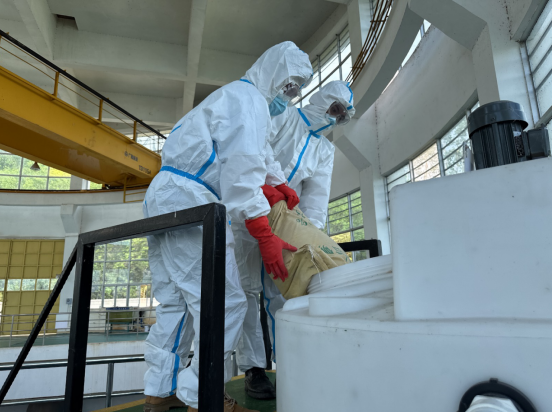 此次演练围绕原水油迹污染及pH异常偏低两个场景展开。演练中,发现“取水口出现少量油迹污染”后,吸水泵房巡检人员立即上报并警戒现场,应急小组迅速携带拦油网、吸油毯赶赴现场,30分钟内完成油污拦截与吸附,快速控制污染。随后模拟原水pH值为6.3时,吸水泵房应急加药系统迅速启动,现场处置组协同配置药剂、调试设备,精准投加调节,不到1小时即让水质稳定在安全范围。演练过程中,吸水泵房作为一线处置阵地,及时启动应急预案,确保取水水质符合生产要求。同时,将观洞水库作为备用水源随时待命,形成“即战即防”的坚实防线。