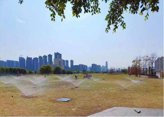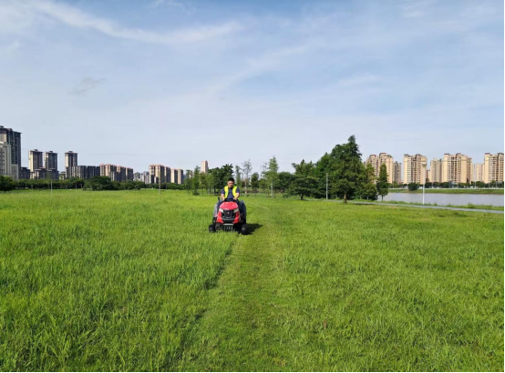 在高效推进绿化管护的同时,管护项目持续优化人机配合作业。一方面,机械打草替代传统人工作业,每日减少4人次投入,作业效率提升近30%;另一方面,配合智能喷淋系统,精准灌溉抑尘,避免积水烂根,同时控制湿度、杜绝蚊虫孳生温床,实现护绿与防蚊“一举两得”。